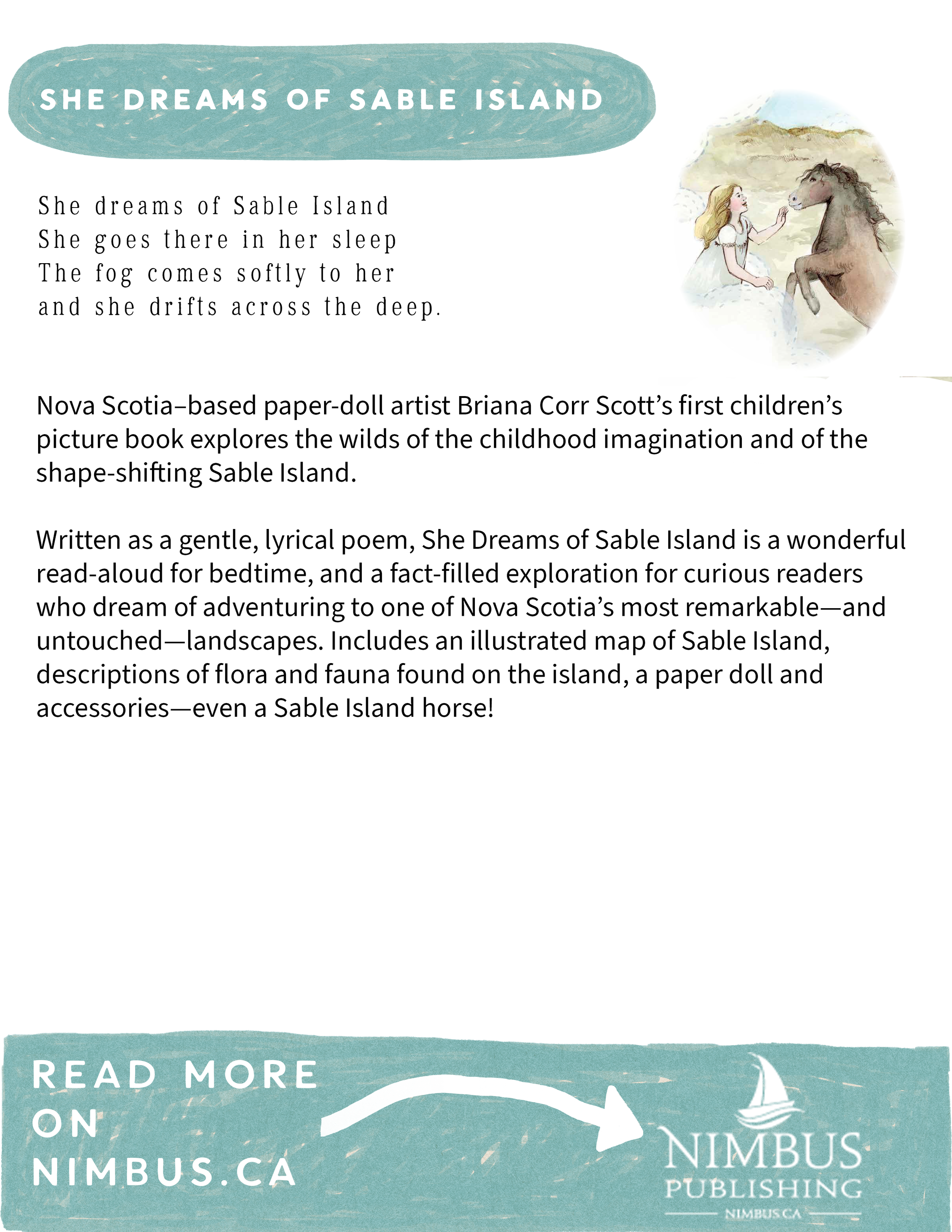 Slide 1 Slide 1 (current slide) Slide 2 Slide 2 (current slide) Slide 3 Slide 3 (current slide) Slide 4 Slide 4 (current slide) Slide 5 Slide 5 (current slide) Slide 6 Slide 6 (current slide) Slide 7 Slide 7 (current slide) Videos about this book Where do I purchase “She Dreams of Sable Island?” From the author Author signed books are available for local pick up in Dartmouth, Nova Scotia. From the publisher Nimbus Publishing, Halifax, NSvisit Open Book Coffee, Halifax Ships to Canada Woozles / NSBookmark/ NSFlying Kite Shop /NSLunenburg Bound /NSGood Dog Books / NSIndigo / Canada Egg Head Books/ NSBisset Books /NSTattletales / NSBC / Salt Spring BooksON / Mables Fables Ships to USA USA/ Barnes and Noble MA/ Porter Square BooksNH / Toadstool BooksRI / Charter Hill BooksRI/ Books on the SquareNY/ Astoria BookshopME/ Longfellow Books