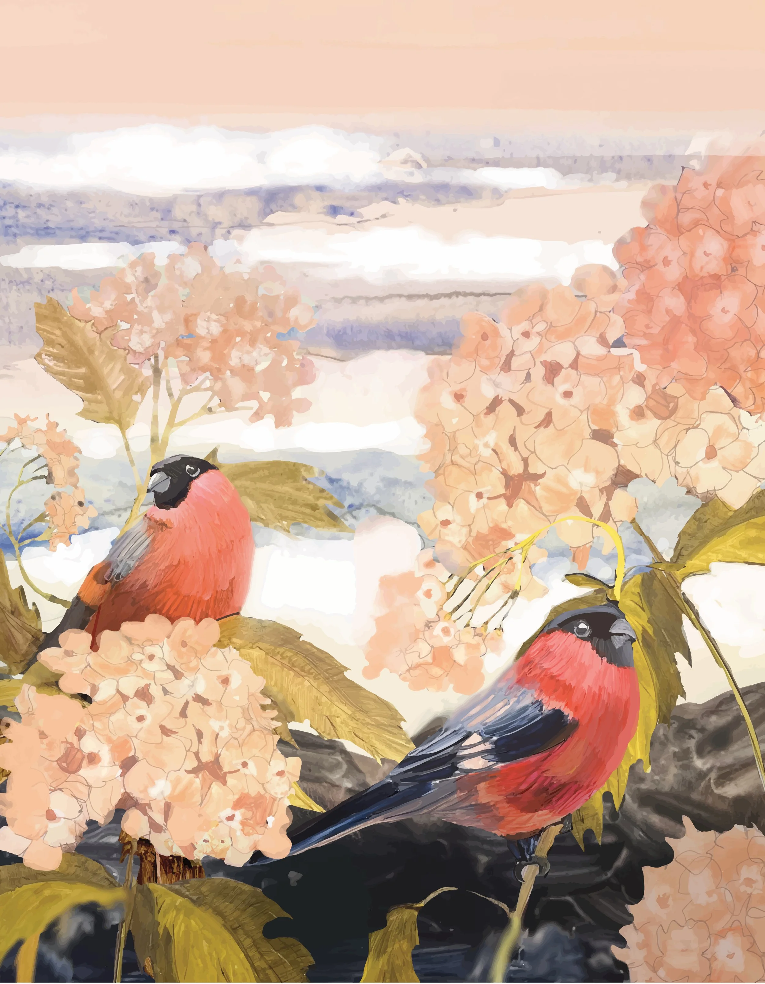 Hyrdangeas and Finches, 2023. Oil on paper, collage, mixed media.