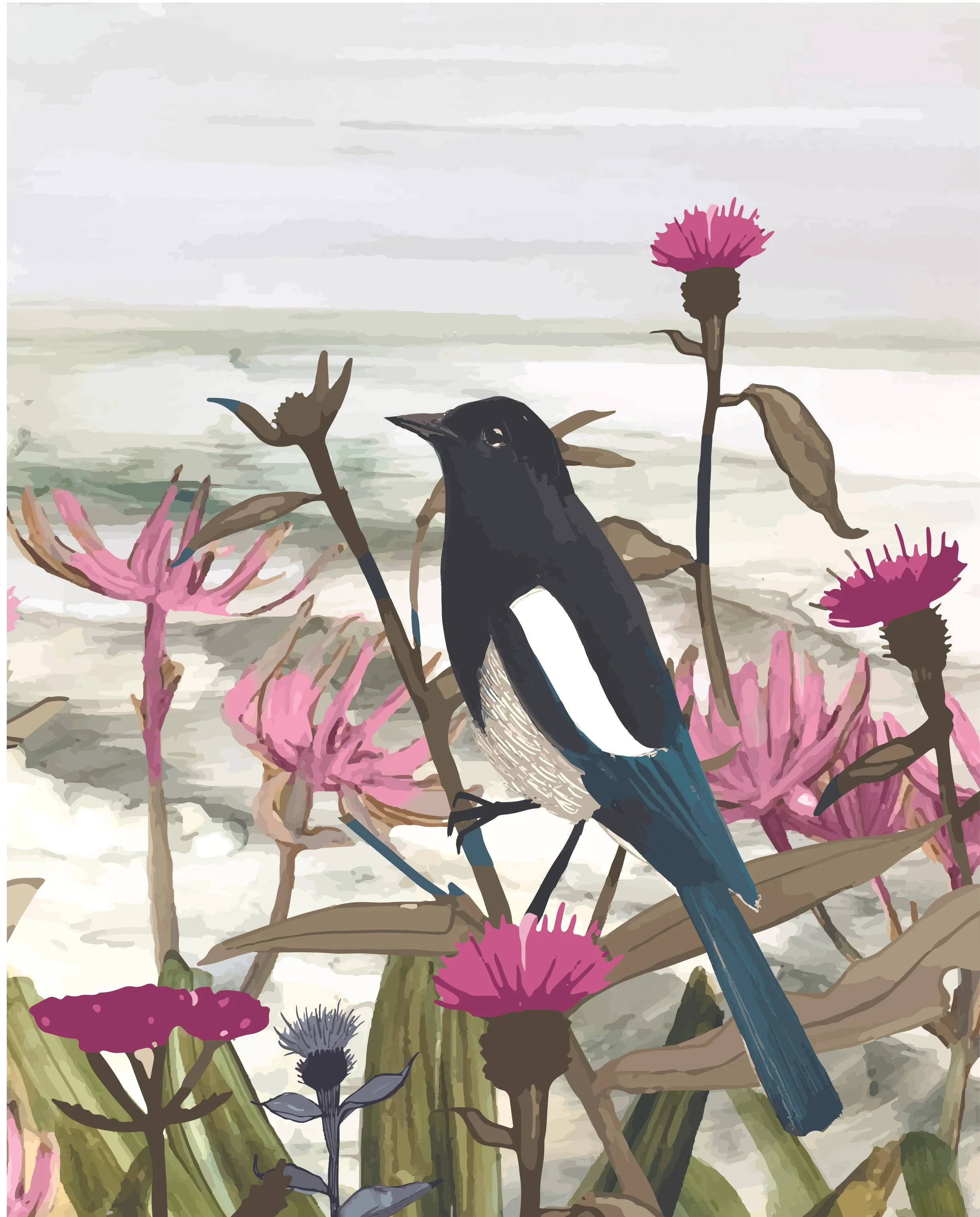Magpie by the Sea. 2021. Mixed media: oil painting, paper collage, digital.