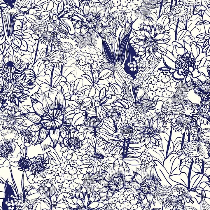 Riot of Flowers. Repeating pattern / illustration. 2022. Ink line drawing, digital.
