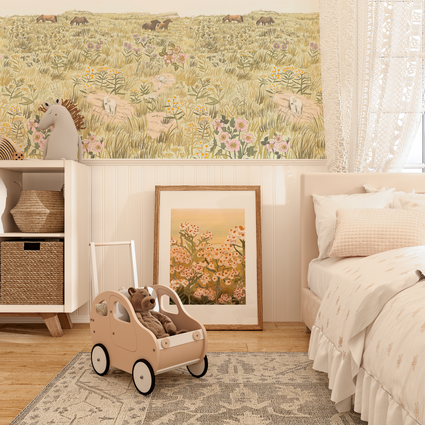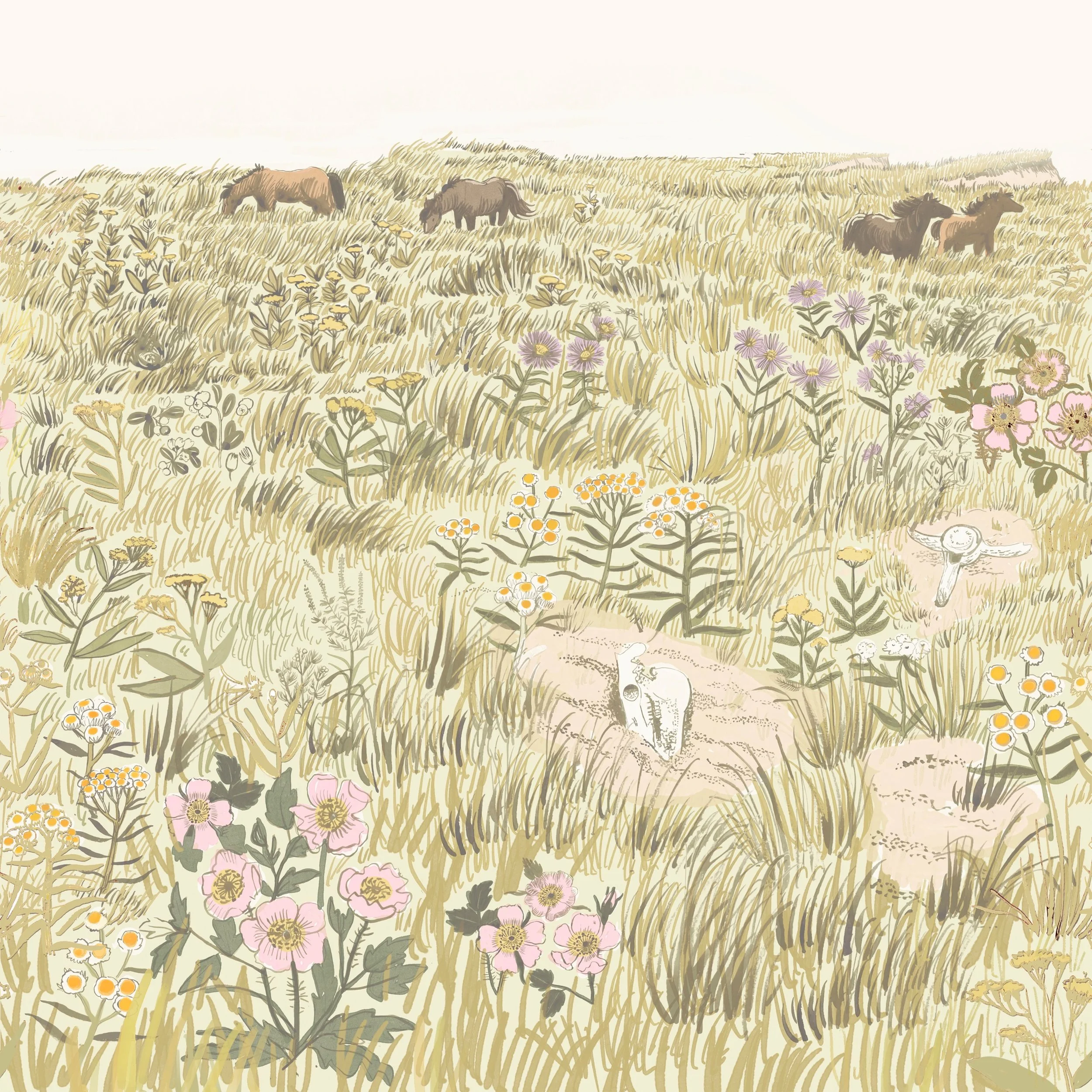 This illustration is designed as a seamless, horizontally repeating pattern. It was created using hand-painted ink drawings in yellow ochre, with digital colour layered on top to bring depth and richness to the final composition. Intended for use as a mural, the image features a solid-coloured sky that allows for flexible cropping and easy adjustment to fit various ceiling heights.